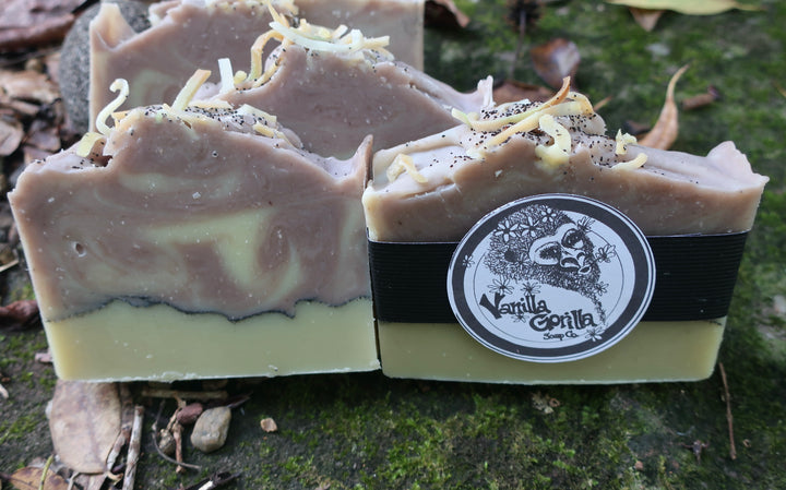 Bar of soap with a Vanilla Gorilla Soap Co. label on a natural background